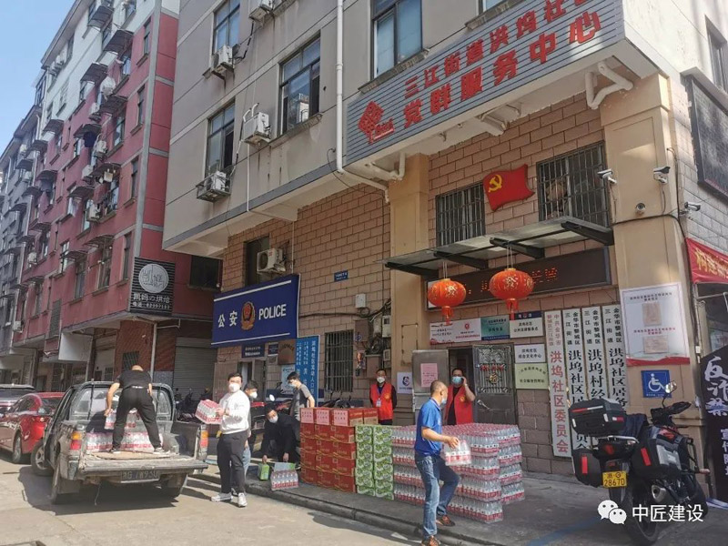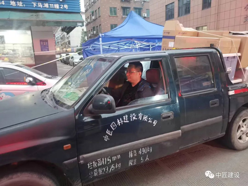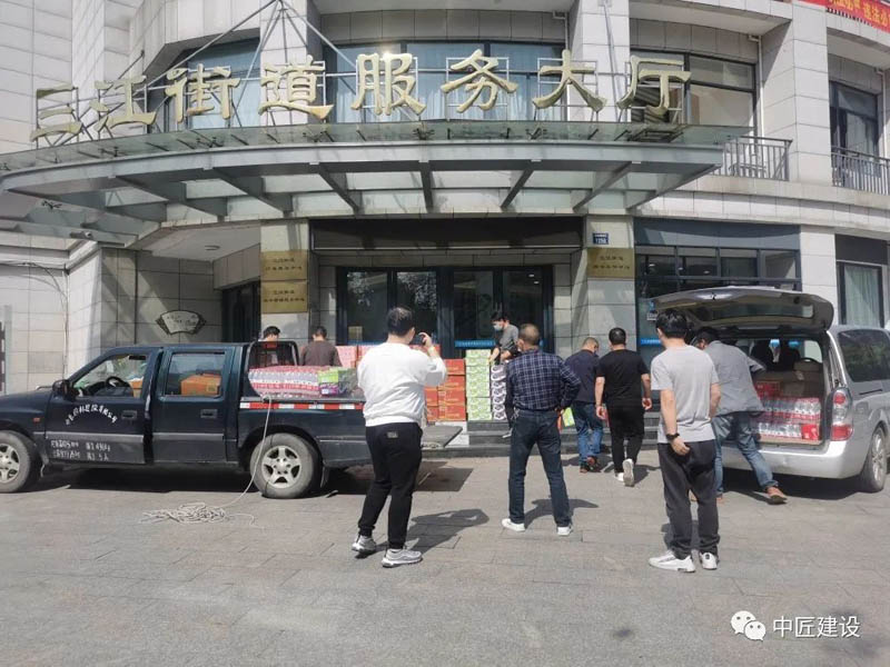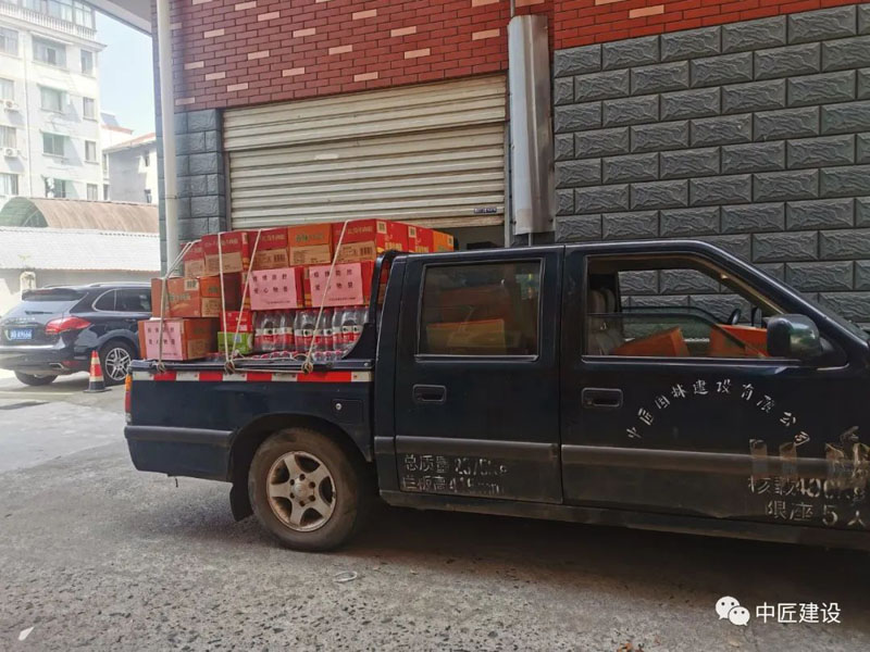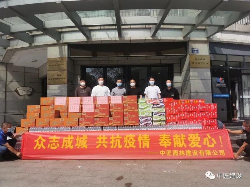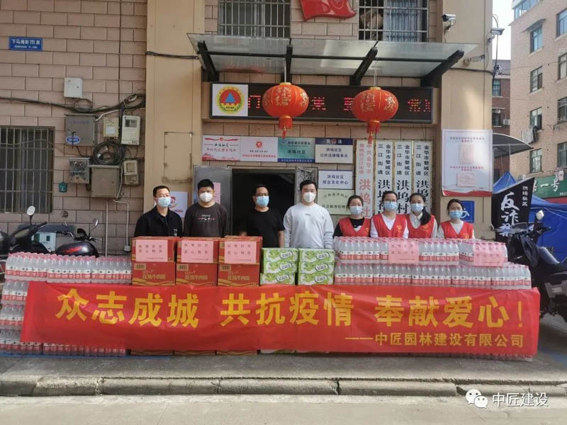 On the afternoon of April 21,chairman Zhan Xujun of Zhongjiang Garden Construction Co.,Ltd.led the vice general managers Jin Liqin,sun Zhonghua and other key personnel of the company,loaded with milk,mineral water,Babao porridge,instant noodles and other materials,to Sanjiang street and Hongwu community to express condolences to the anti epidemic personnel who stick to the front line of the epidemic,and make a modest contribution to winning the Sniper War of epidemic prevention and control.
