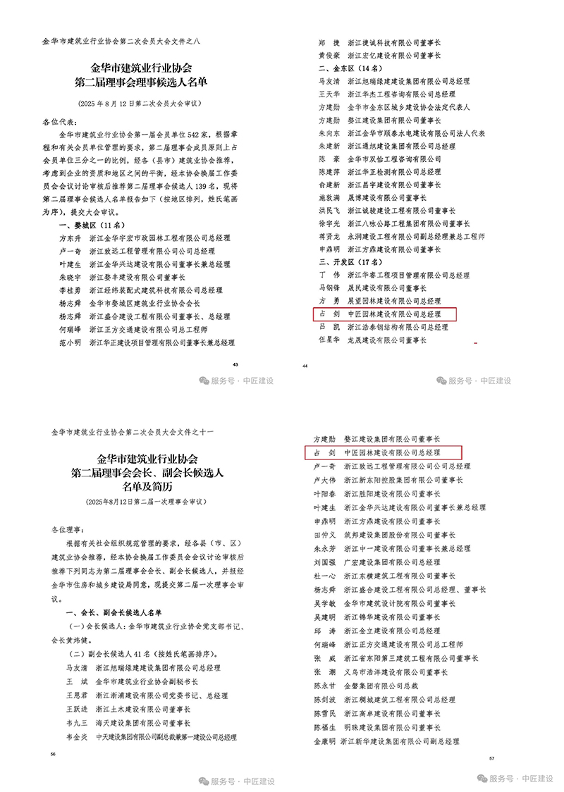 本次大會(huì)總結(jié)了上一屆理事會(huì)工作,審議通過(guò)了一系列重要文件,選舉產(chǎn)生了新一屆理事會(huì)和領(lǐng)導(dǎo)機(jī)構(gòu),我司總經(jīng)理占劍憑借其卓越的行業(yè)影響力、豐富的管理經(jīng)驗(yàn)和突出的領(lǐng)導(dǎo)才能,成功當(dāng)選為常務(wù)理事及副會(huì)長(zhǎng)。這一任命不僅是對(duì)占劍個(gè)人成就的高度認(rèn)可,也標(biāo)志著中匠建設(shè)在金華市建筑領(lǐng)域的地位進(jìn)一步提升。